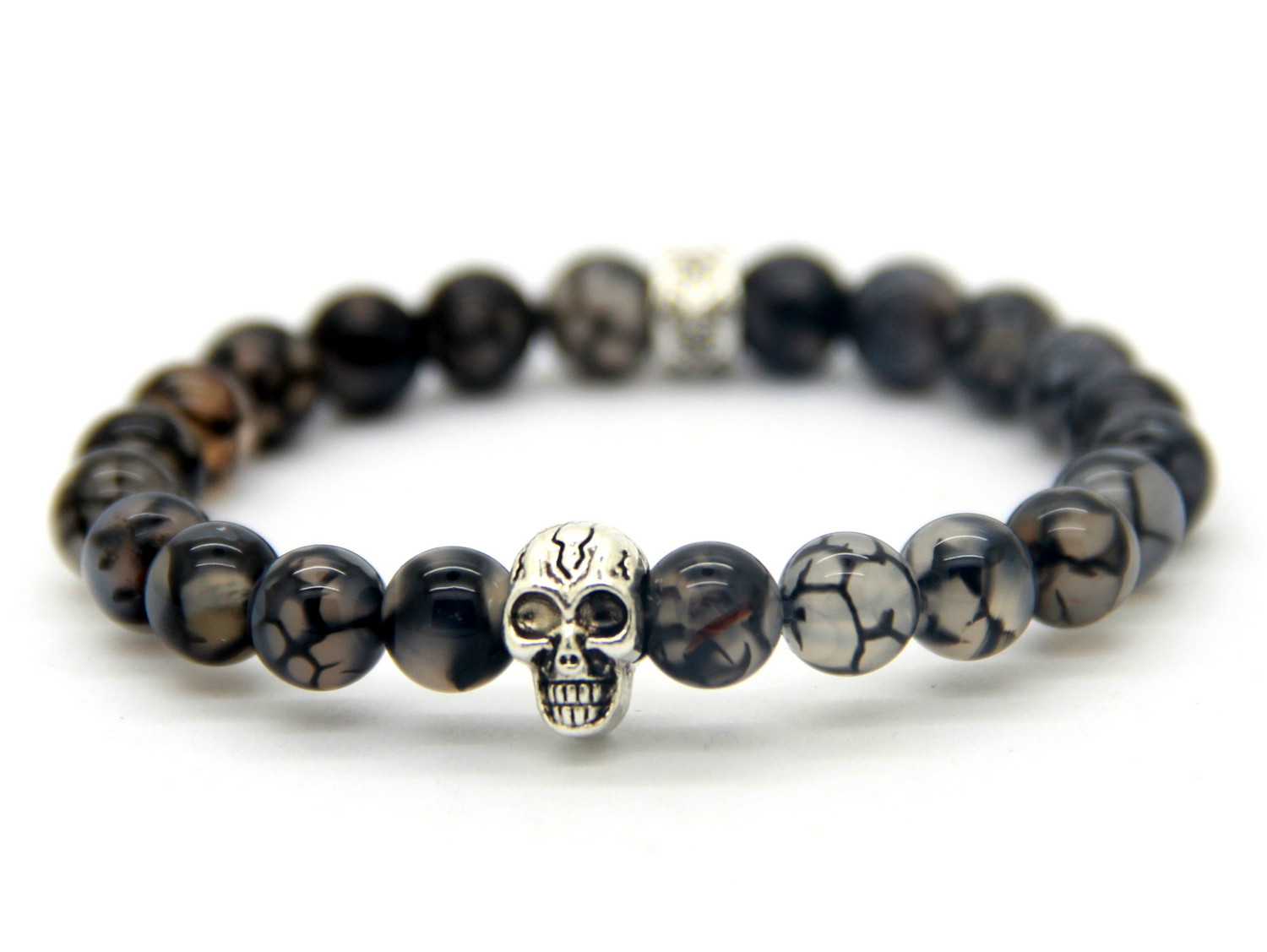 Grey Dragon Veins Agate Beads with Silver Skull Bracelet
